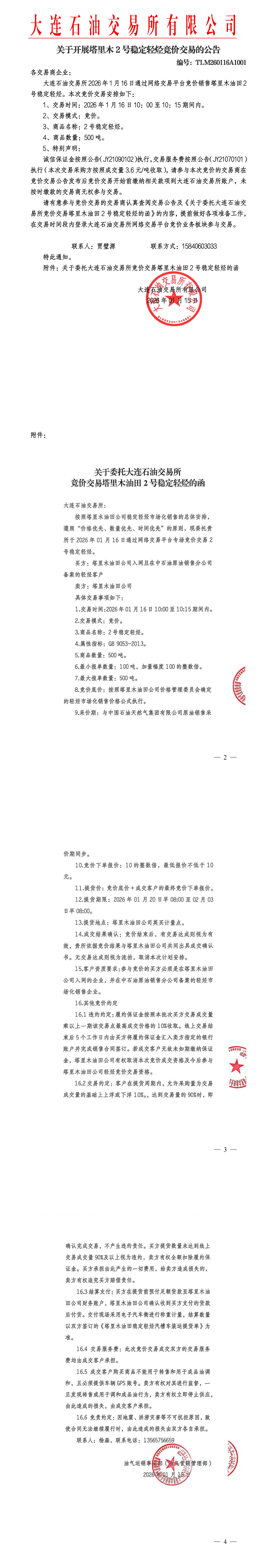 关于开展塔里木稳定轻烃竞价交易的公告(TLM260116A1001)