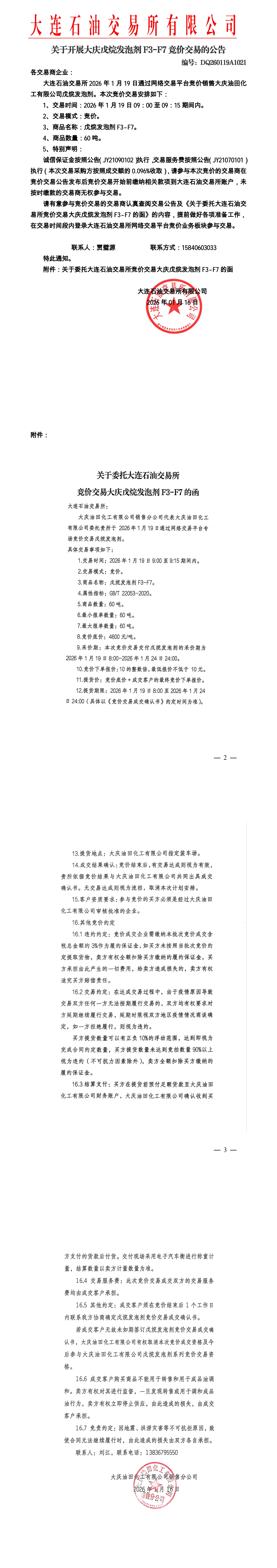 关于开展大庆戊烷发泡剂竞价交易的公告(DQ260119A1021)