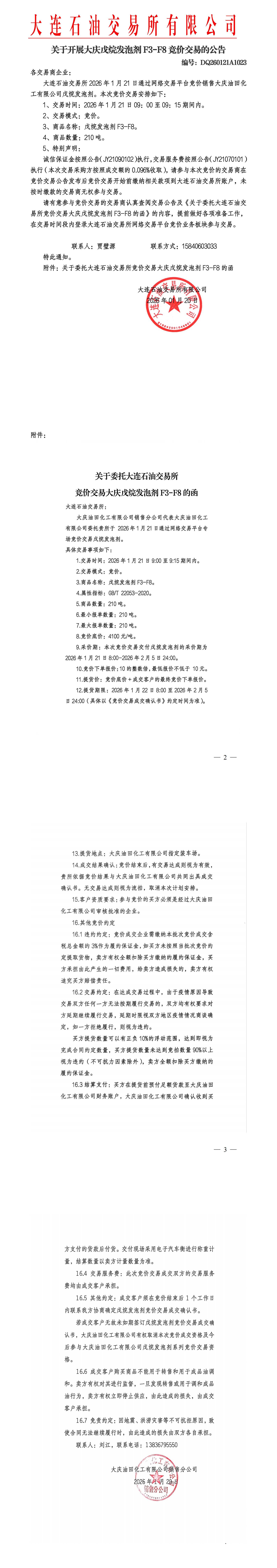 关于开展大庆戊烷发泡剂竞价交易的公告(DQ260121A1023)
