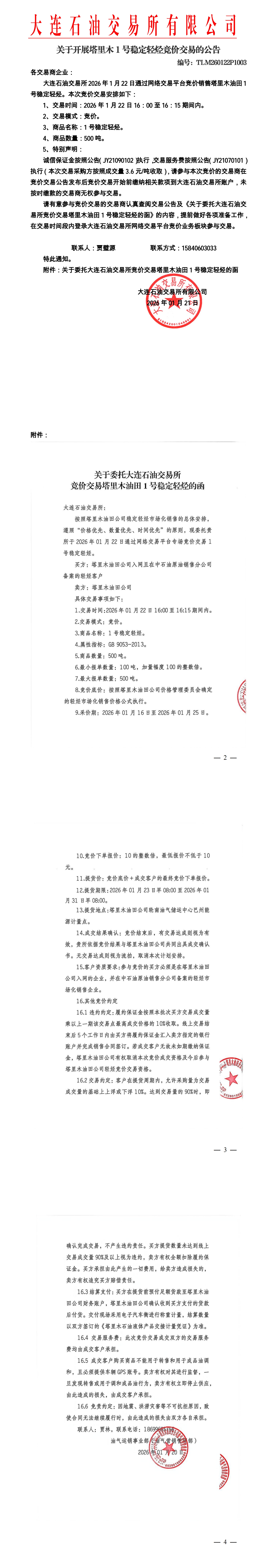 关于开展塔里木稳定轻烃竞价交易的公告(TLM260122P1003)