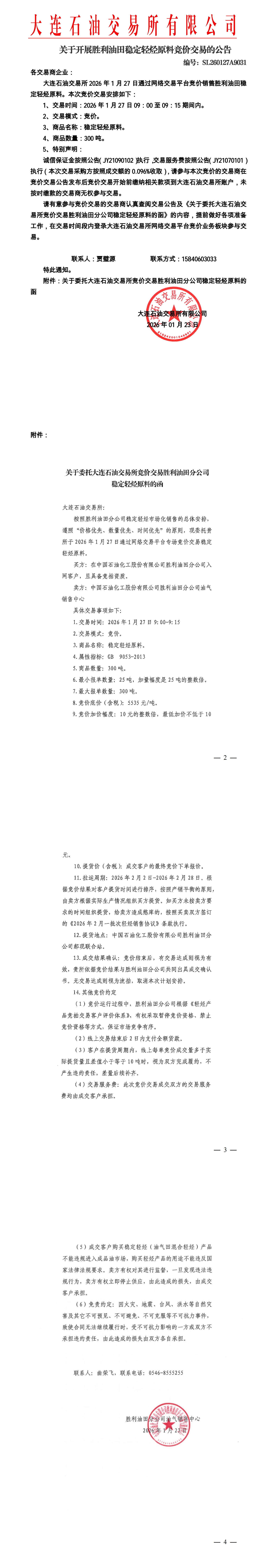 关于开展胜利油田稳定轻烃原料竞价交易的公告(SL260127A9031)