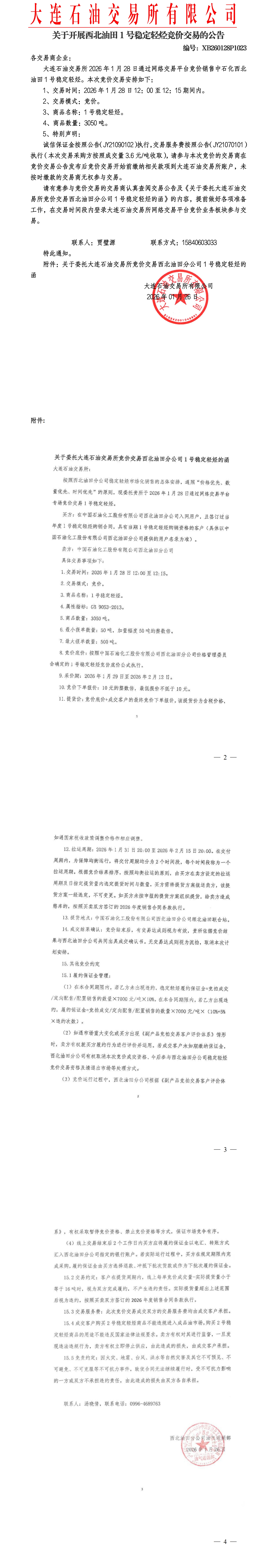 关于开展西北油田稳定轻烃竞价交易的公告(XB260128P1023)