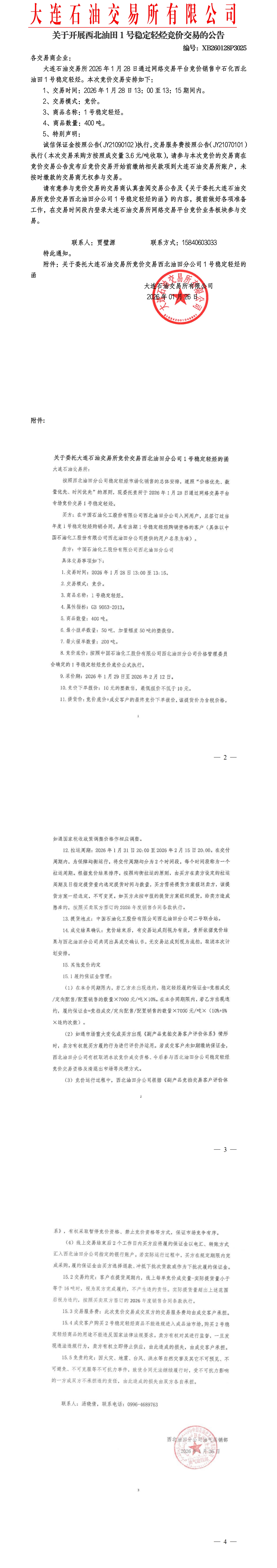 关于开展西北油田稳定轻烃竞价交易的公告(XB260128P3025)
