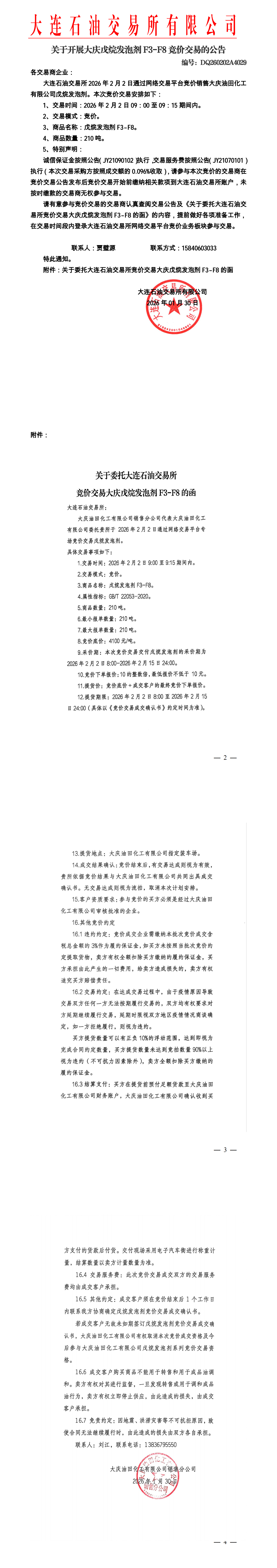 关于开展大庆戊烷发泡剂竞价交易的公告(DQ260202A4029)