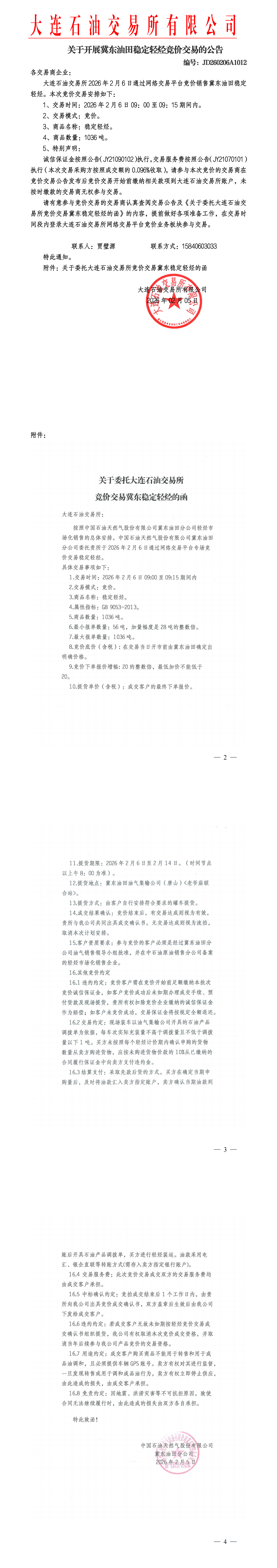 关于开展冀东油田稳定轻烃竞价交易的公告(JD260206A1012)