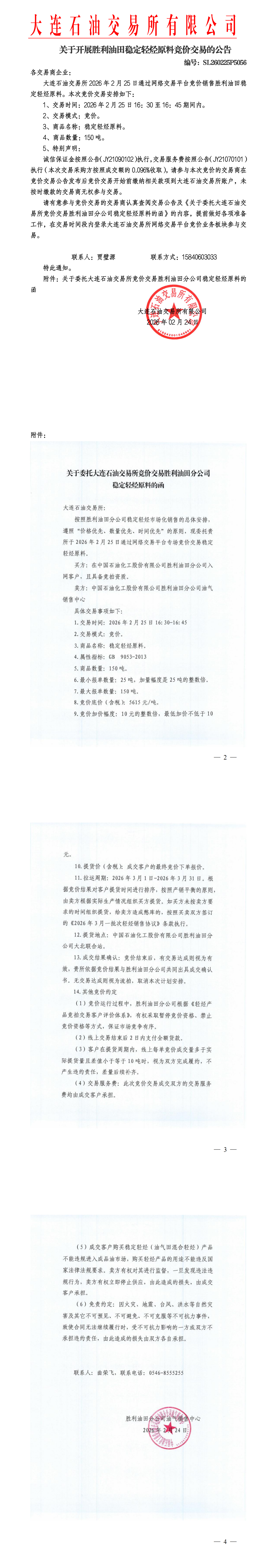 关于开展胜利油田稳定轻烃原料竞价交易的公告(SL260225P5056)