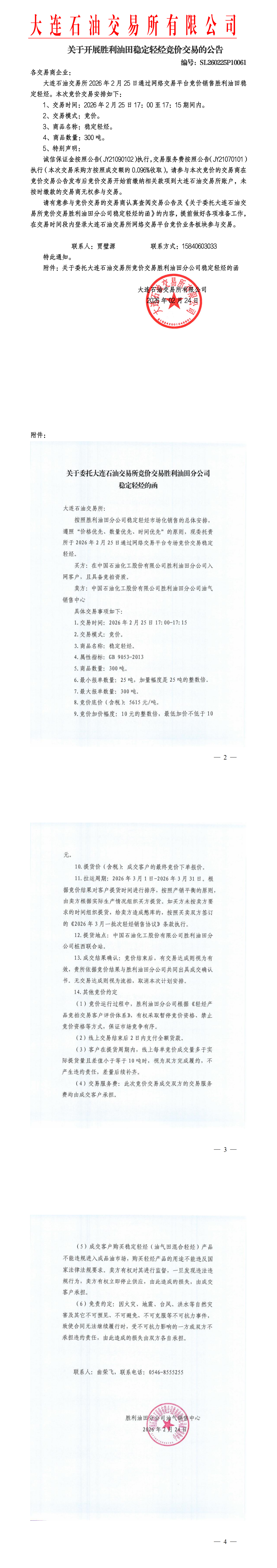 关于开展胜利油田稳定轻烃竞价交易的公告(SL260225P10061)