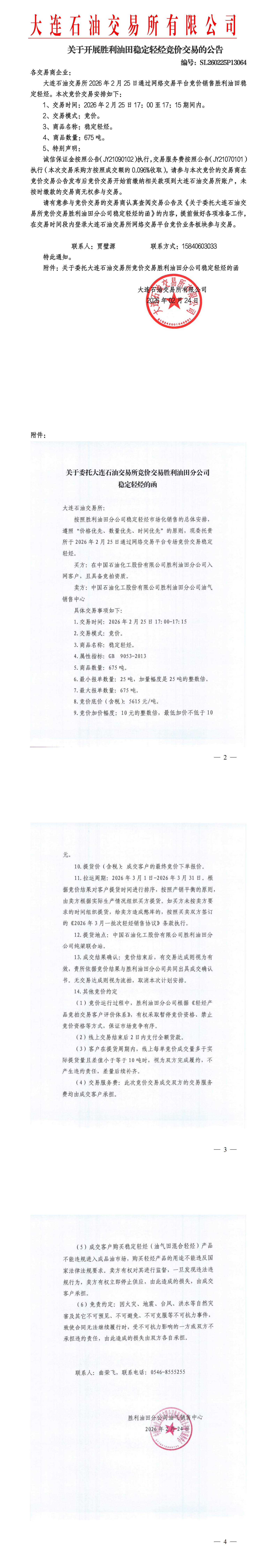 关于开展胜利油田稳定轻烃竞价交易的公告(SL260225P13064)