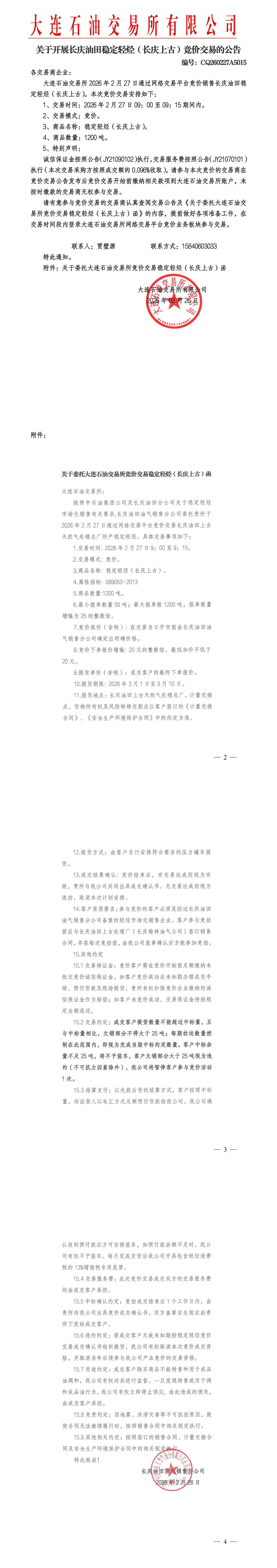 关于开展长庆油田稳定轻烃(长庆上古)竞价交易的公告(CQ260227A5015)