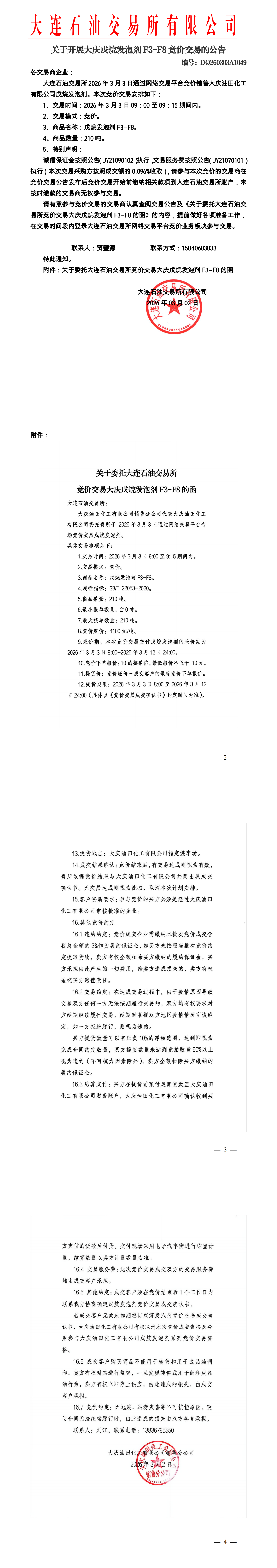 关于开展大庆戊烷发泡剂竞价交易的公告(DQ260303A1049)