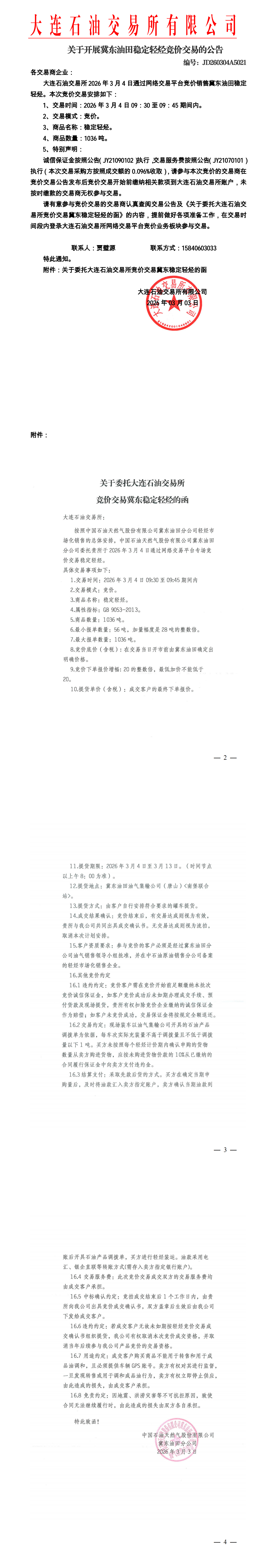 关于开展冀东油田稳定轻烃竞价交易的公告(JD260304A5021)