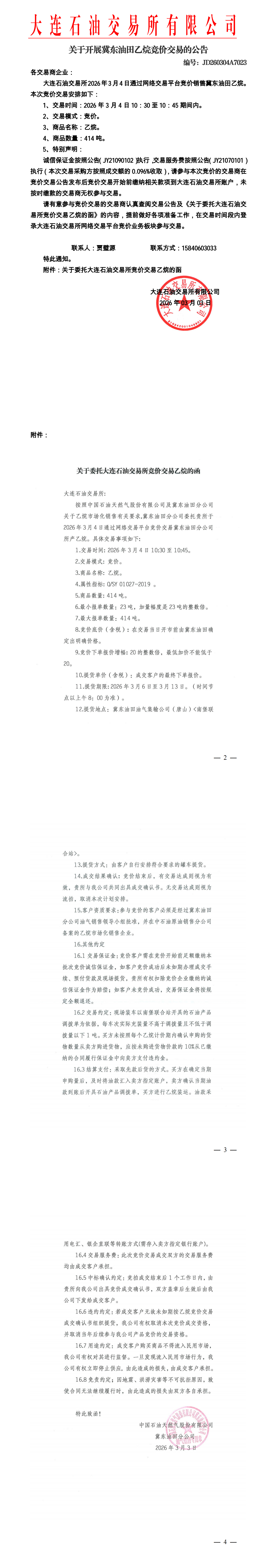 关于开展冀东油田乙烷竞价交易的公告(JD260304A7023)