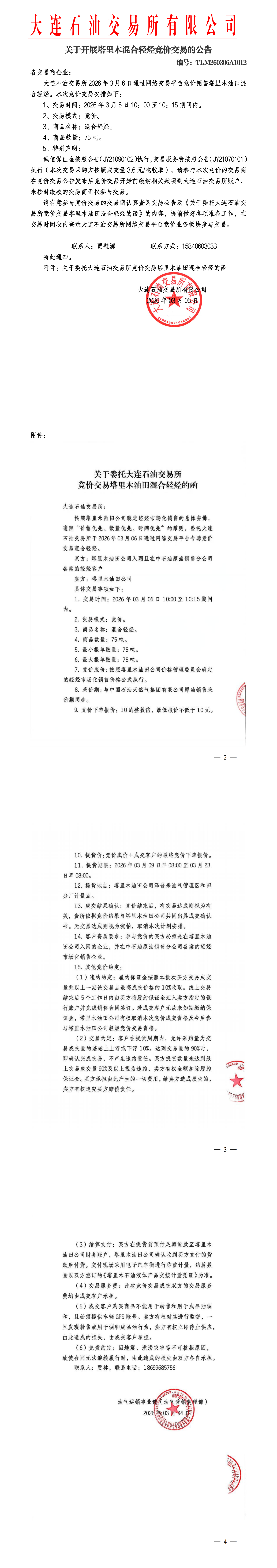 关于开展塔里木混合轻烃竞价交易的公告(TLM260306A1012)