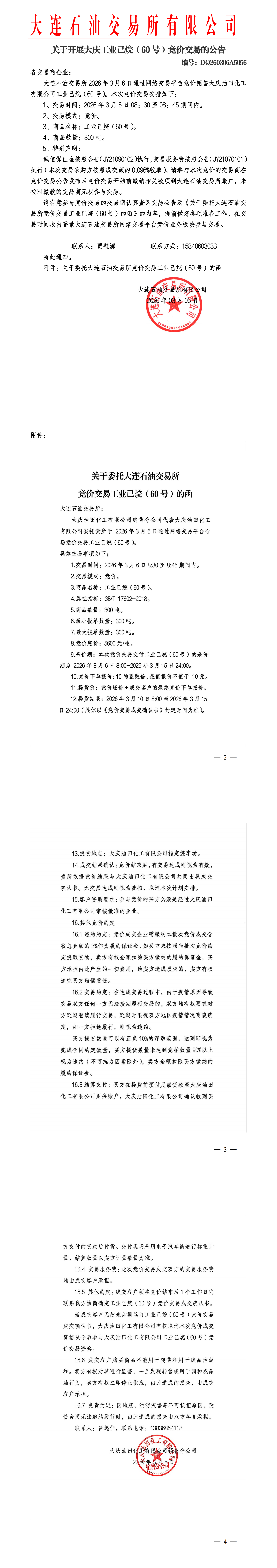 关于开展大庆工业己烷(60号)竞价交易的公告(DQ260306A5056)