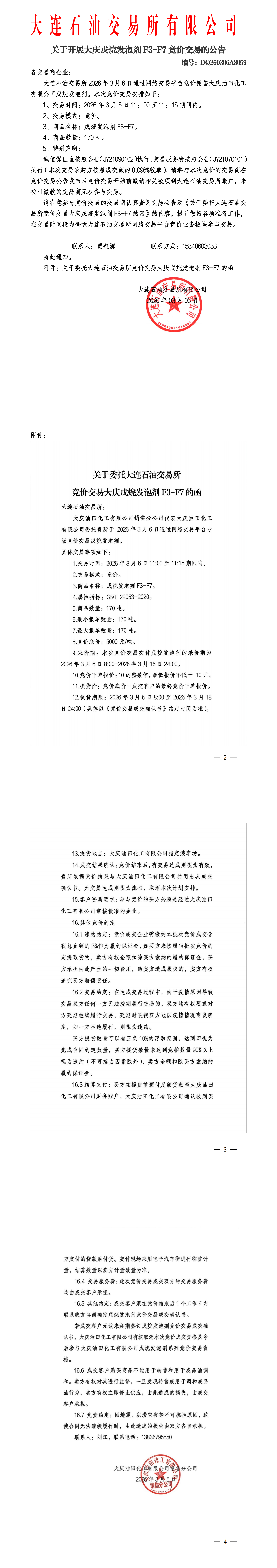 关于开展大庆戊烷发泡剂竞价交易的公告(DQ260306A8059)