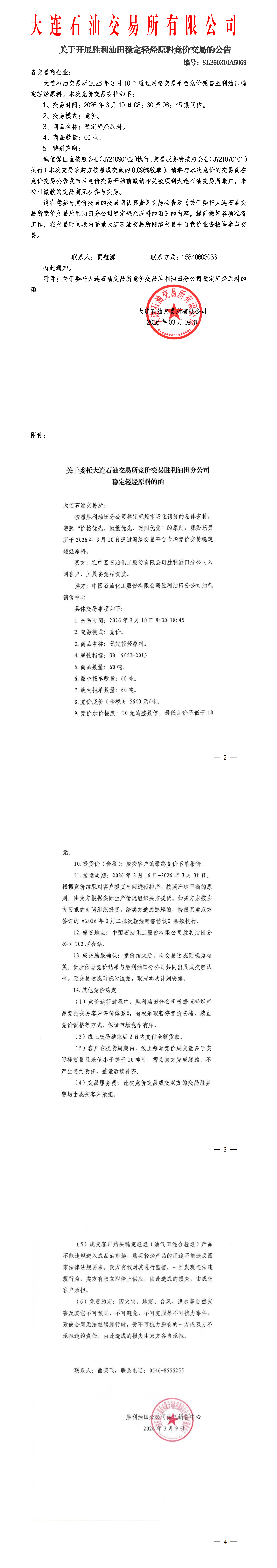 关于开展胜利油田稳定轻烃原料竞价交易的公告(SL260310A5069)