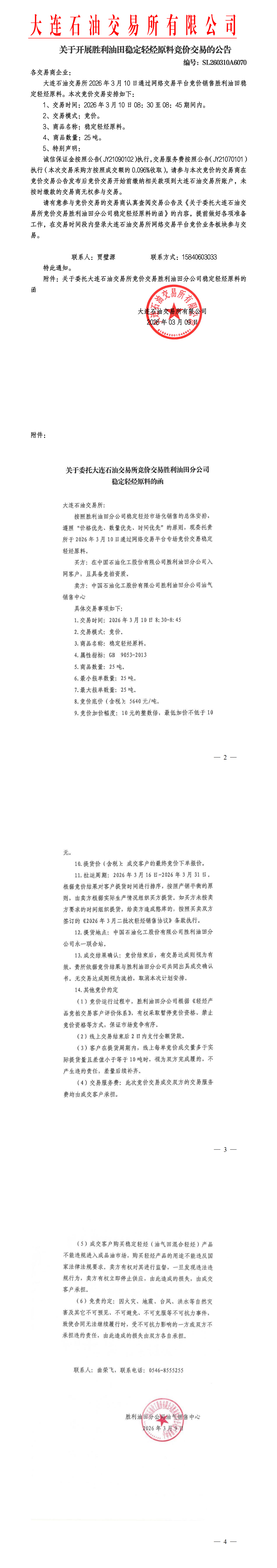 关于开展胜利油田稳定轻烃原料竞价交易的公告(SL260310A6070)