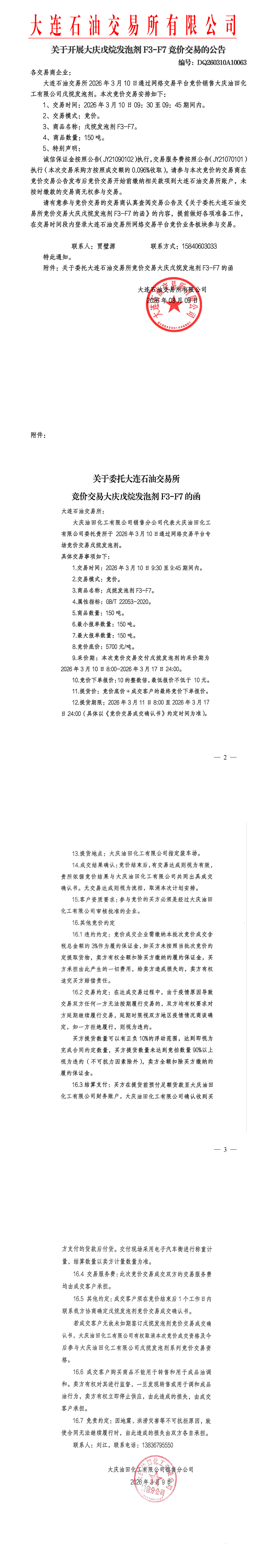 关于开展大庆戊烷发泡剂竞价交易的公告(DQ260310A10063)