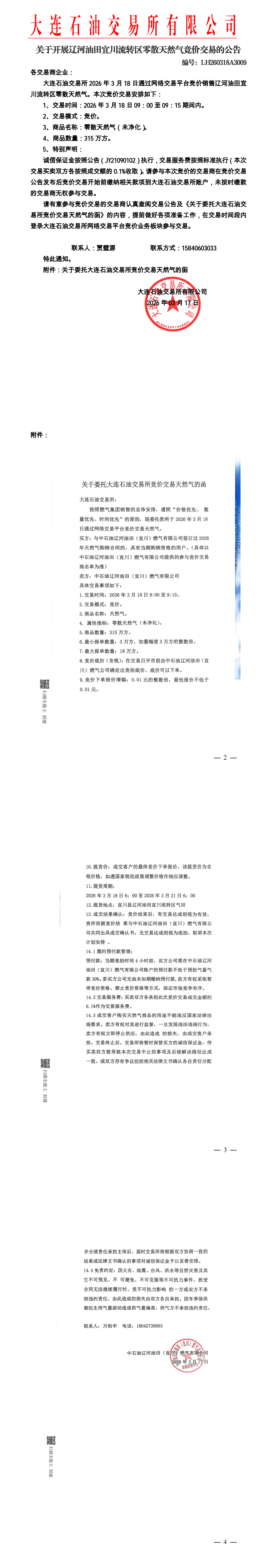 关于开展辽河油田零散天然气竞价交易的公告(LH260318A3009)