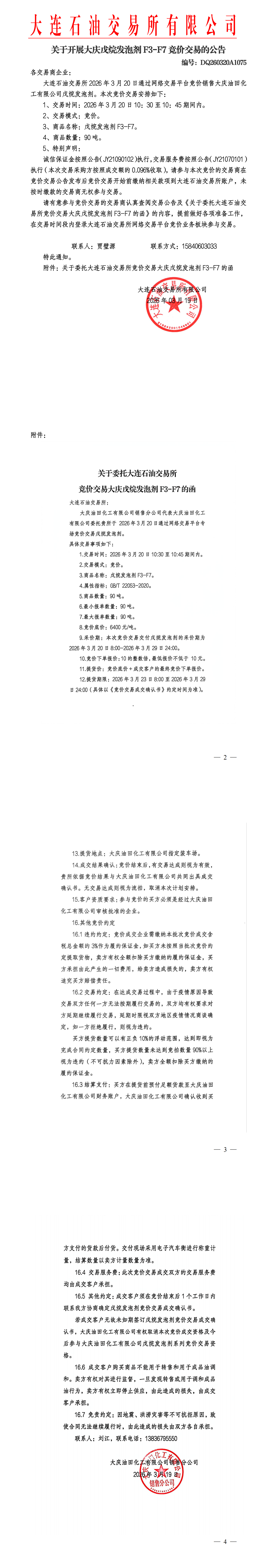 关于开展大庆戊烷发泡剂竞价交易的公告(DQ260320A1075)