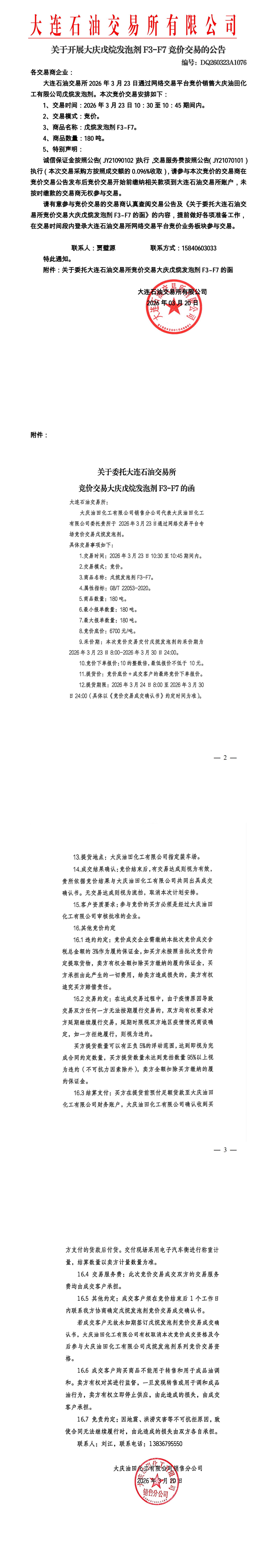 关于开展大庆戊烷发泡剂竞价交易的公告(DQ260323A1076)