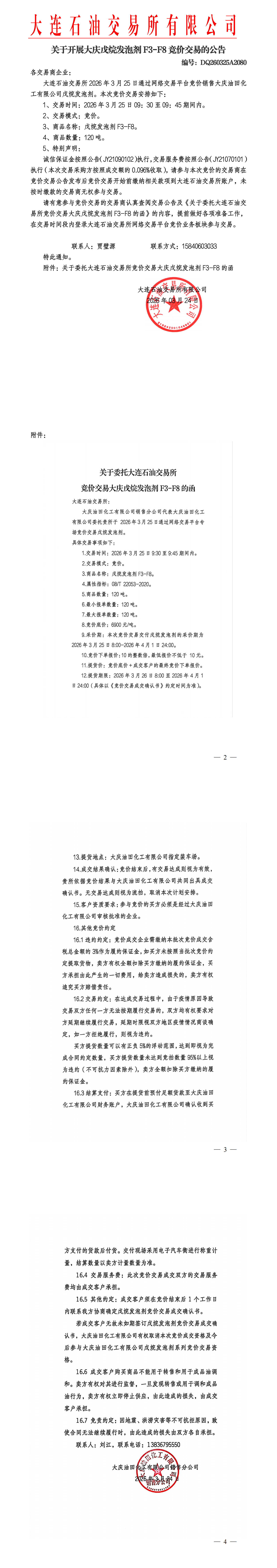 关于开展大庆戊烷发泡剂竞价交易的公告(DQ260325A2080)