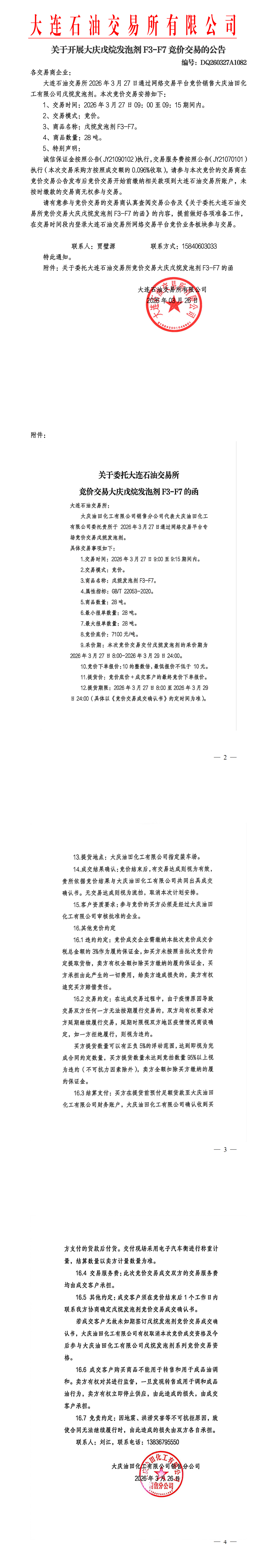 关于开展大庆戊烷发泡剂竞价交易的公告(DQ260327A1082)