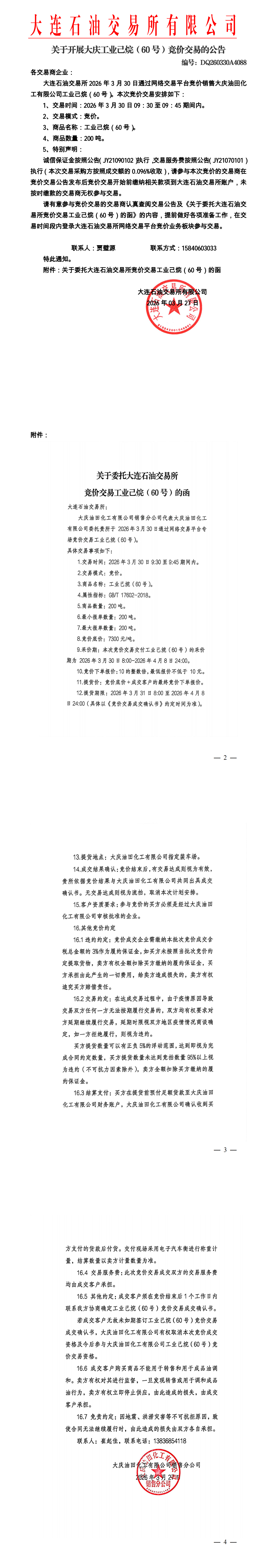 关于开展大庆工业己烷(60号)竞价交易的公告(DQ260330A4088)