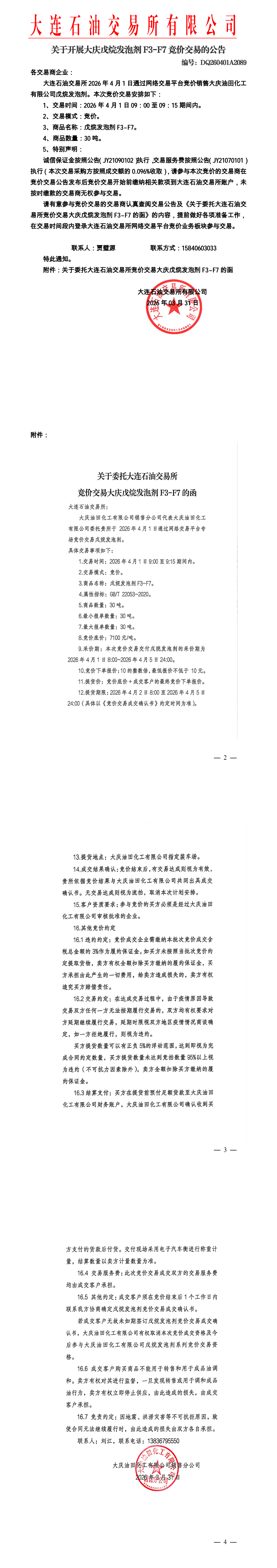 关于开展大庆戊烷发泡剂竞价交易的公告(DQ260401A2089)