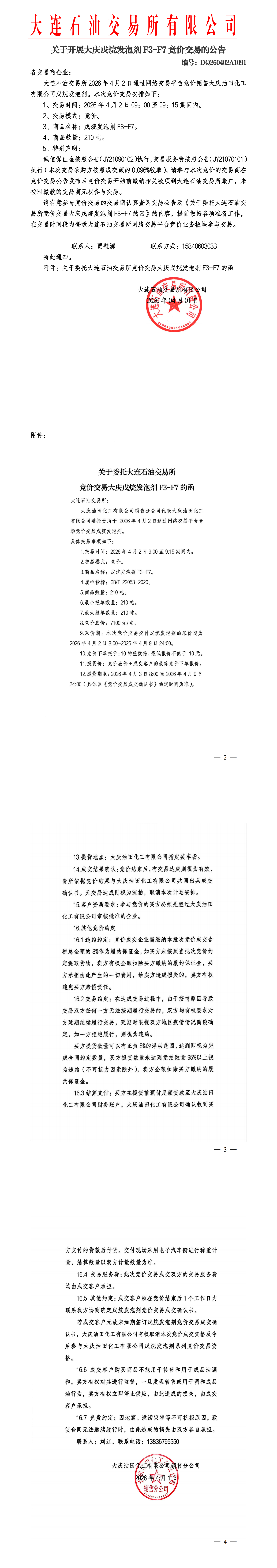 关于开展大庆戊烷发泡剂竞价交易的公告(DQ260402A1091)