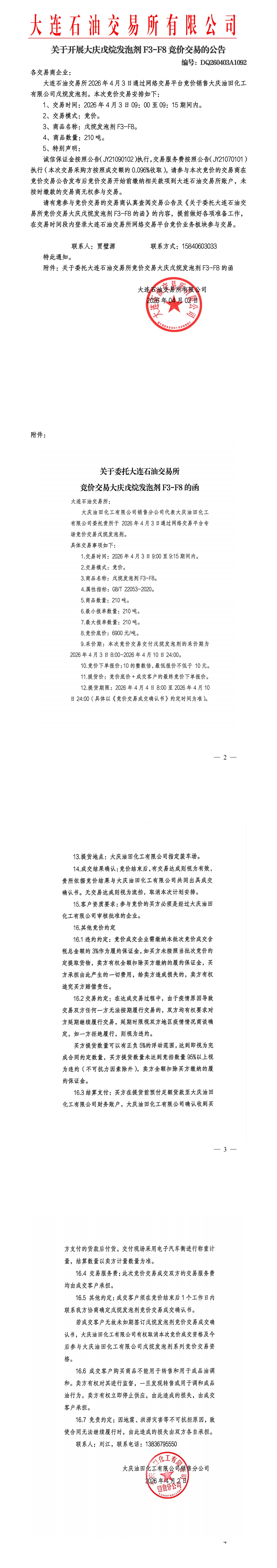 关于开展大庆戊烷发泡剂竞价交易的公告(DQ260403A1092)