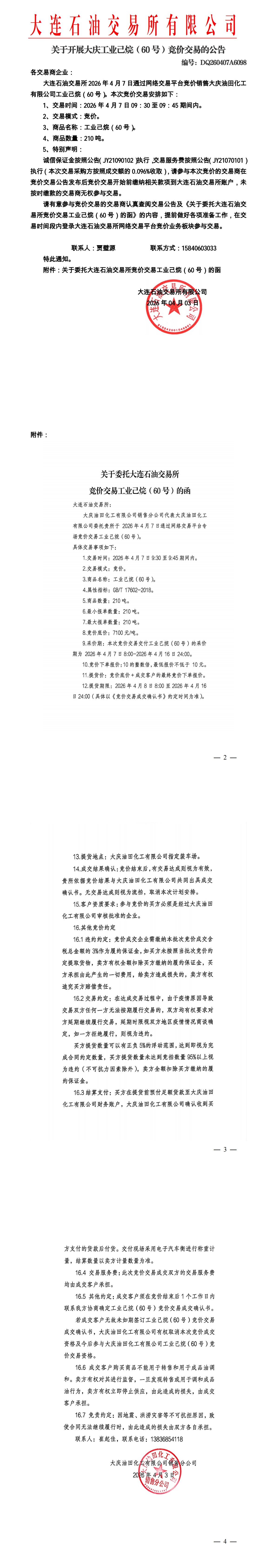 关于开展大庆工业己烷(60号)竞价交易的公告(DQ260407A6098)