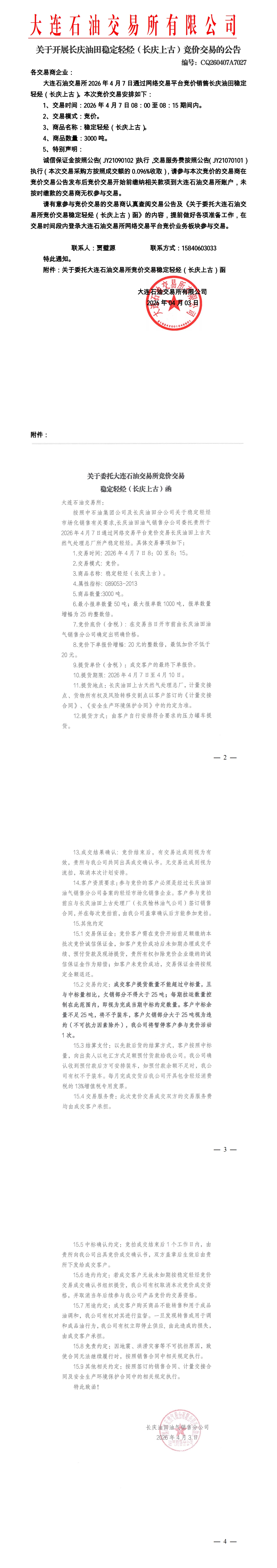 关于开展长庆油田稳定轻烃(长庆上古)竞价交易的公告(CQ260407A7027)