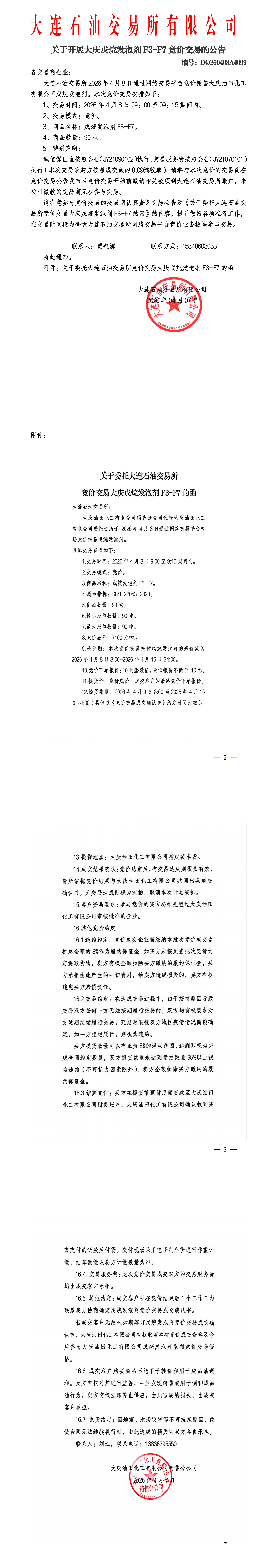 关于开展大庆戊烷发泡剂竞价交易的公告(DQ260408A4099)