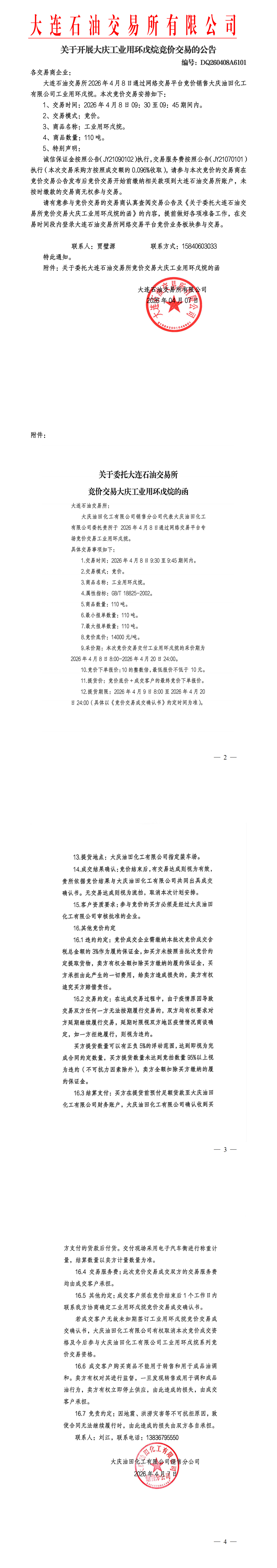 关于开展大庆工业用环戊烷竞价交易的公告(DQ260408A6101)