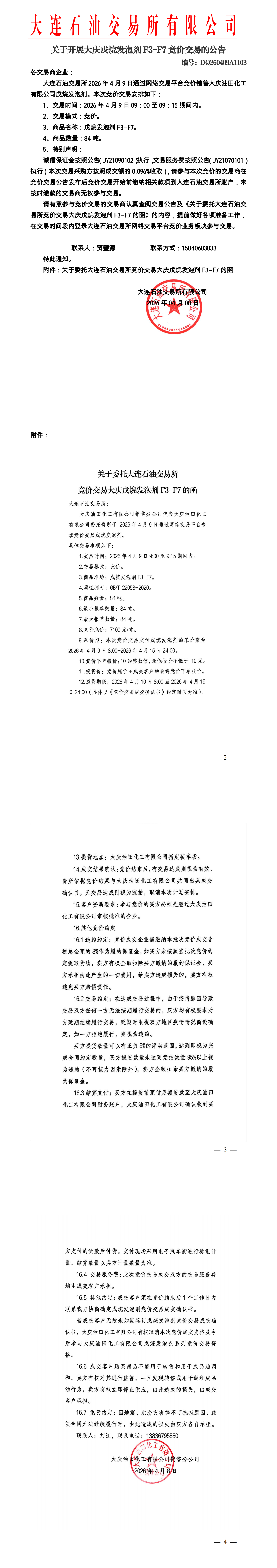 关于开展大庆戊烷发泡剂竞价交易的公告(DQ260409A1103)