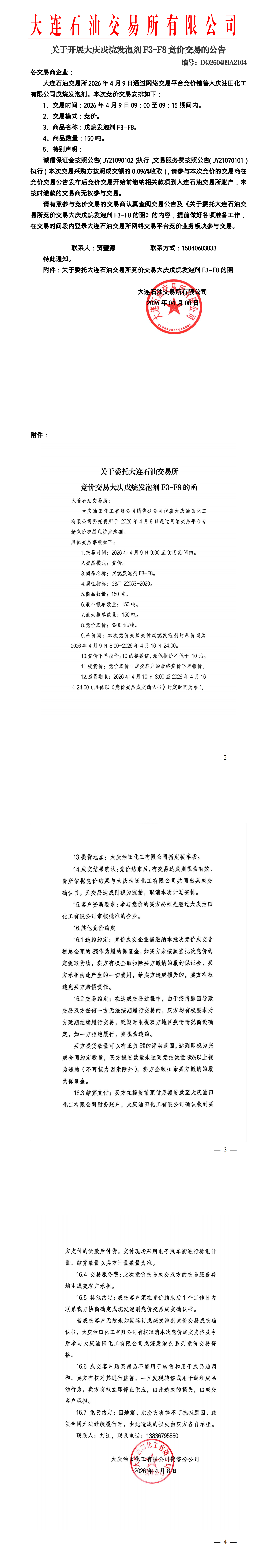 关于开展大庆戊烷发泡剂竞价交易的公告(DQ260409A2104)