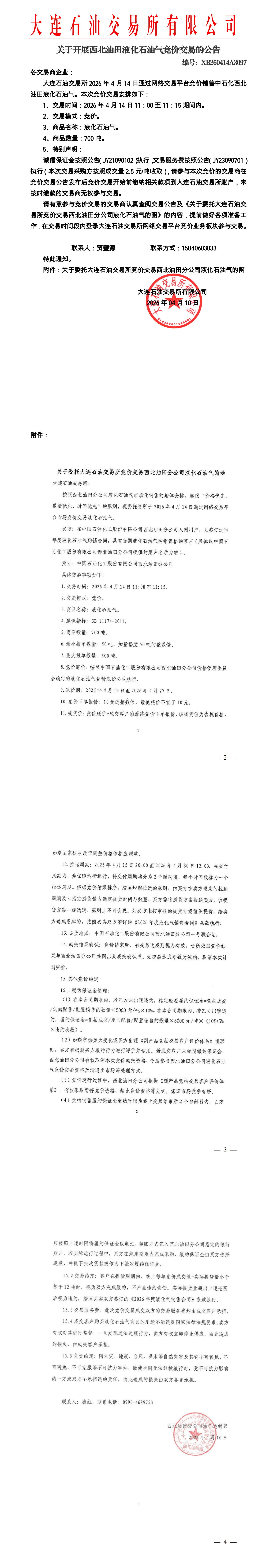 关于开展西北油田液化石油气竞价交易的公告(XB260414A3097)