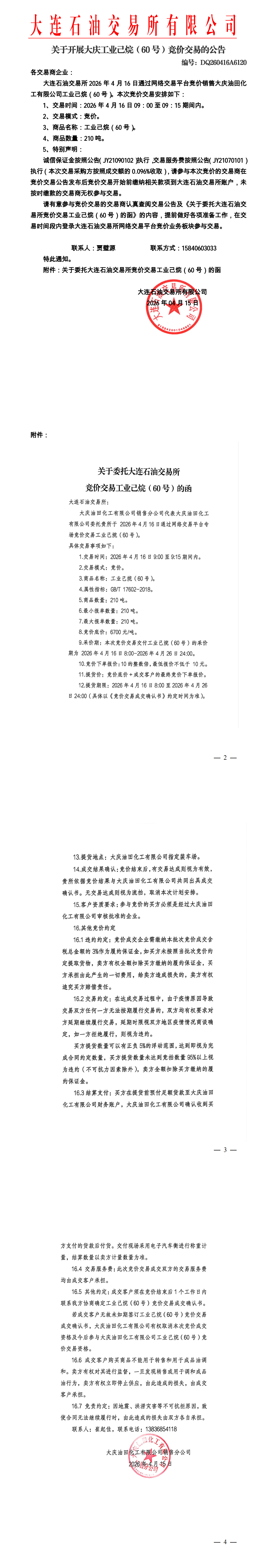 关于开展大庆工业己烷(60号)竞价交易的公告(DQ260416A6120)