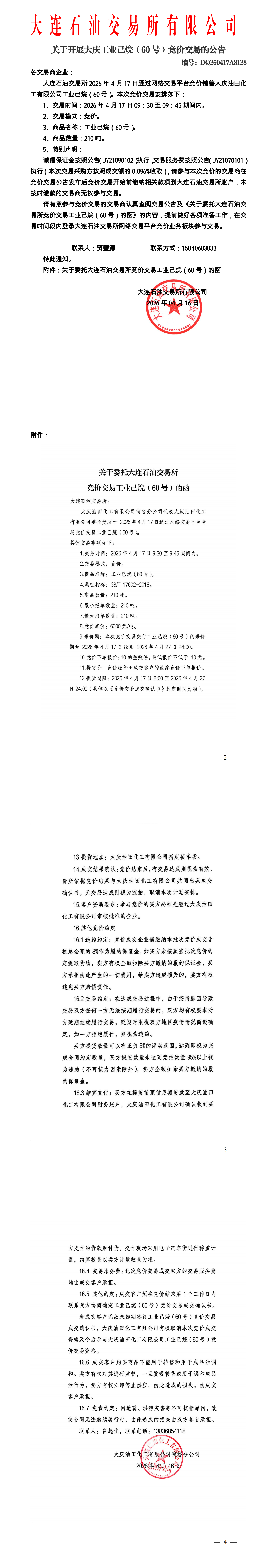 关于开展大庆工业己烷(60号)竞价交易的公告(DQ260417A8128)