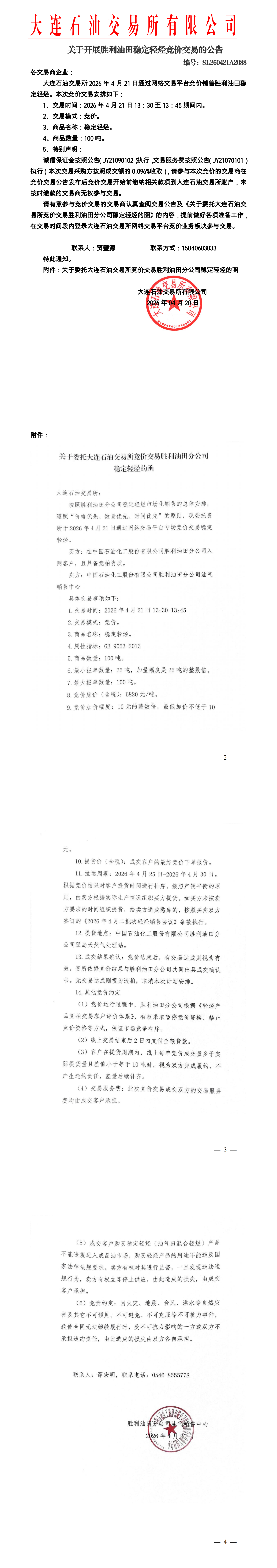 关于开展胜利油田稳定轻烃竞价交易的公告(SL260421A2088)