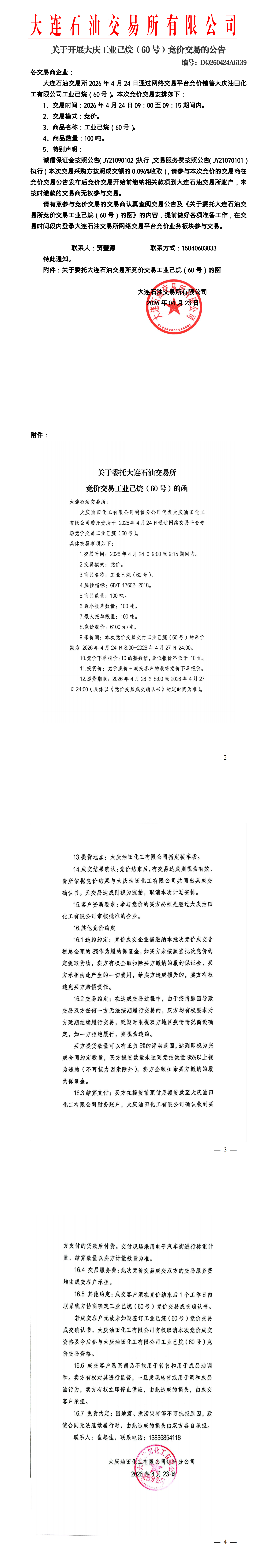 关于开展大庆工业己烷(60号)竞价交易的公告(DQ260424A6139)