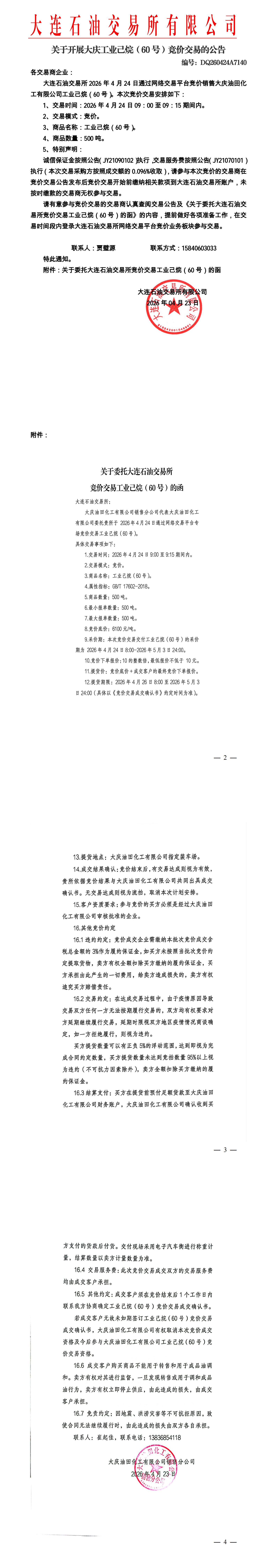 关于开展大庆工业己烷(60号)竞价交易的公告(DQ260424A7140)