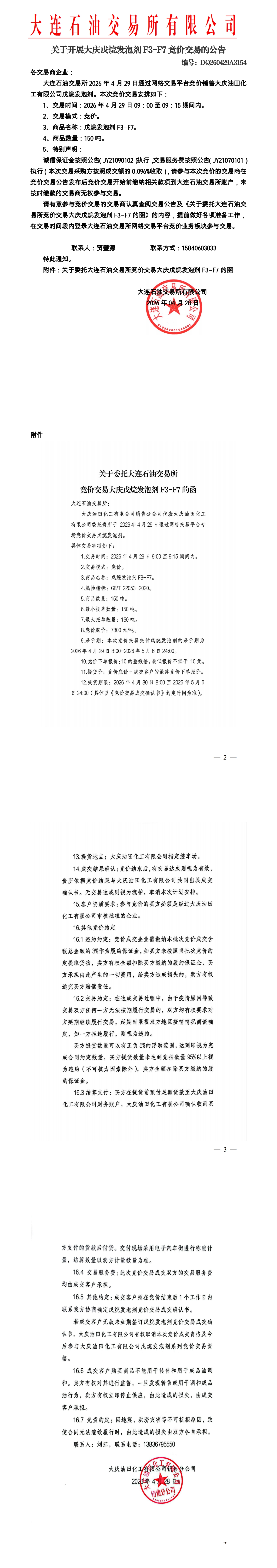 关于开展大庆戊烷发泡剂竞价交易的公告(DQ260429A3154)