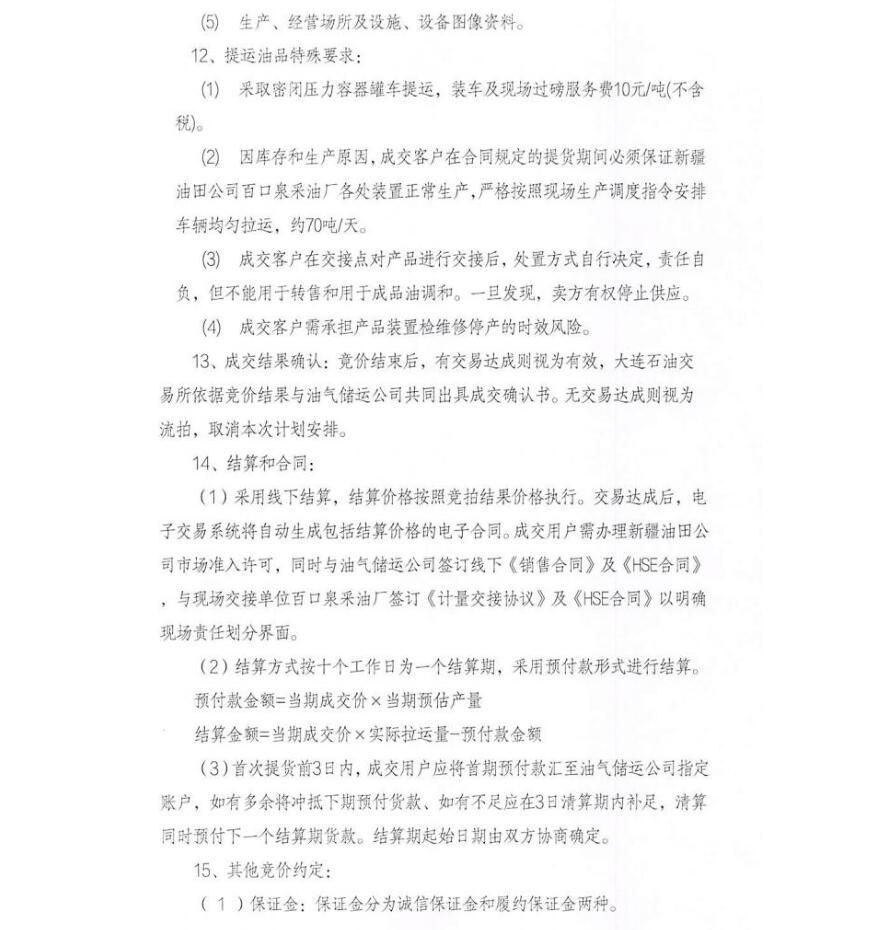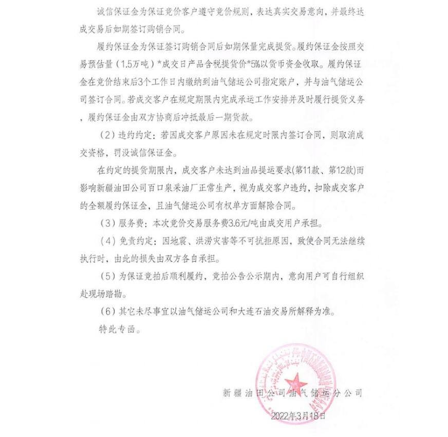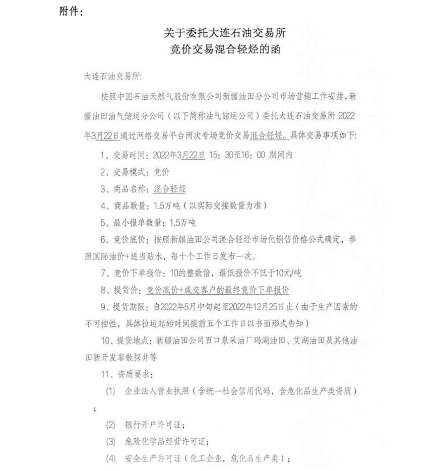 关于新疆油田开展混合轻烃竞价交易的公告(XJ220322P1004)