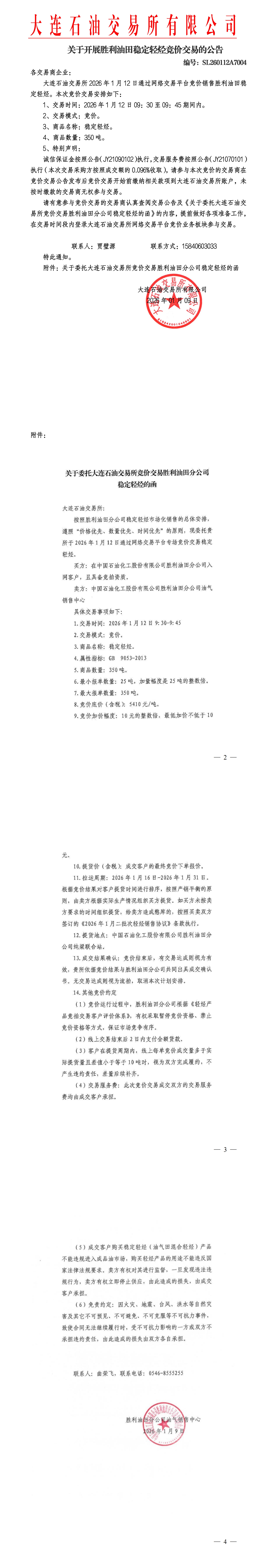 关于开展胜利油田稳定轻烃竞价交易的公告(SL260112A7004)